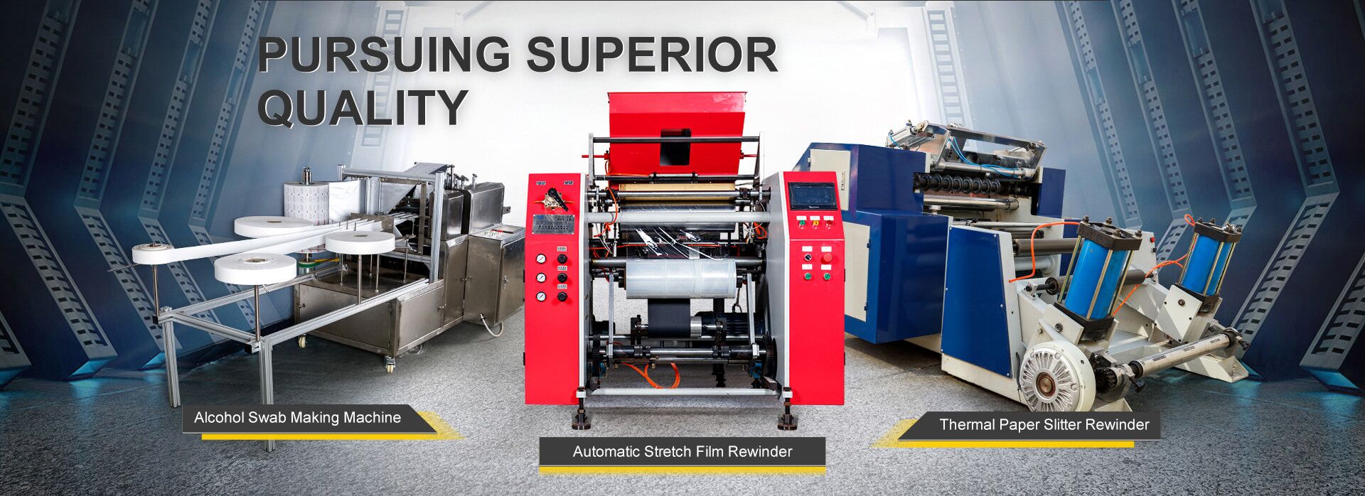 様々なスリット&巻き戻し機械に特化した当社,ストレッチフィルム機,しがみつきフィルム機,アルミホイル機,アルコールパッド機,アルコール綿棒機,ロール紙スリッターなどが含まれます.